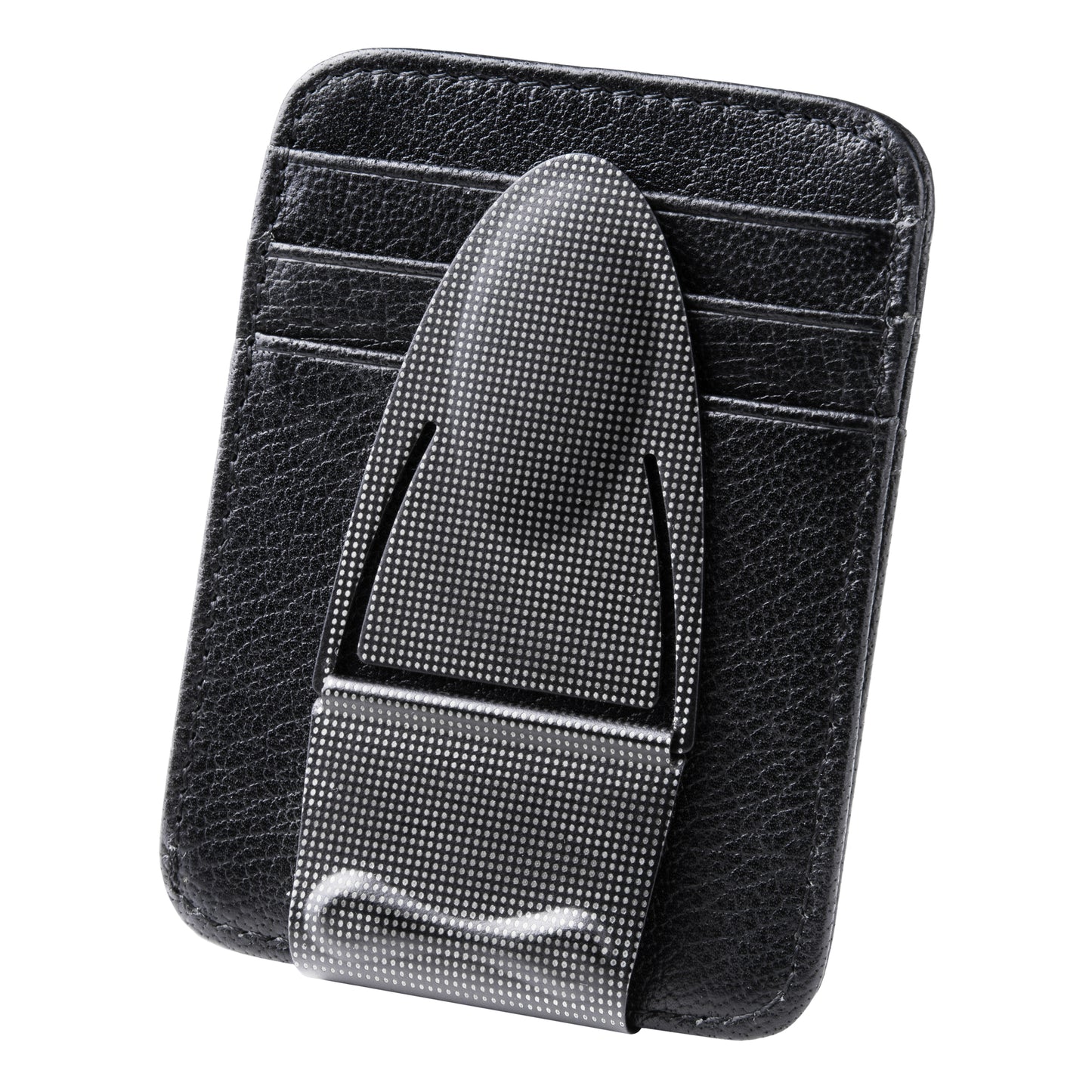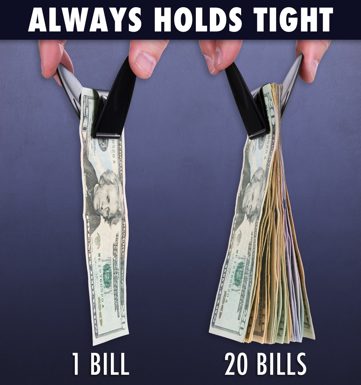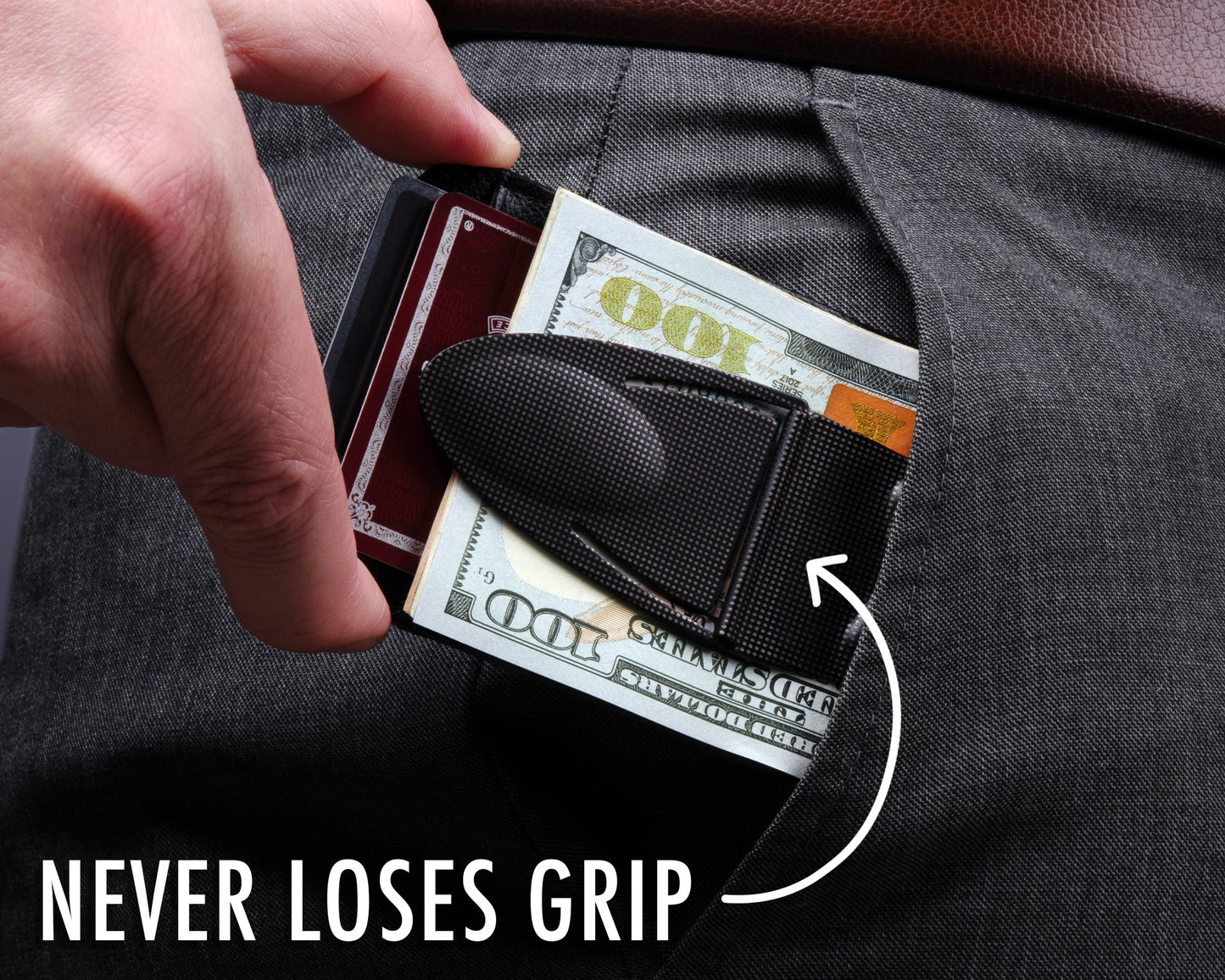 Elevating its practicality, the MoneyClamp® is accompanied by a minimalist, ultra-slim black leather wallet equipped with state-of-the-art RFID blocking technology. This advanced feature provides an additional layer of protection against electronic theft, effectively shielding your sensitive card data from potential skimmers and safeguarding your financial information.