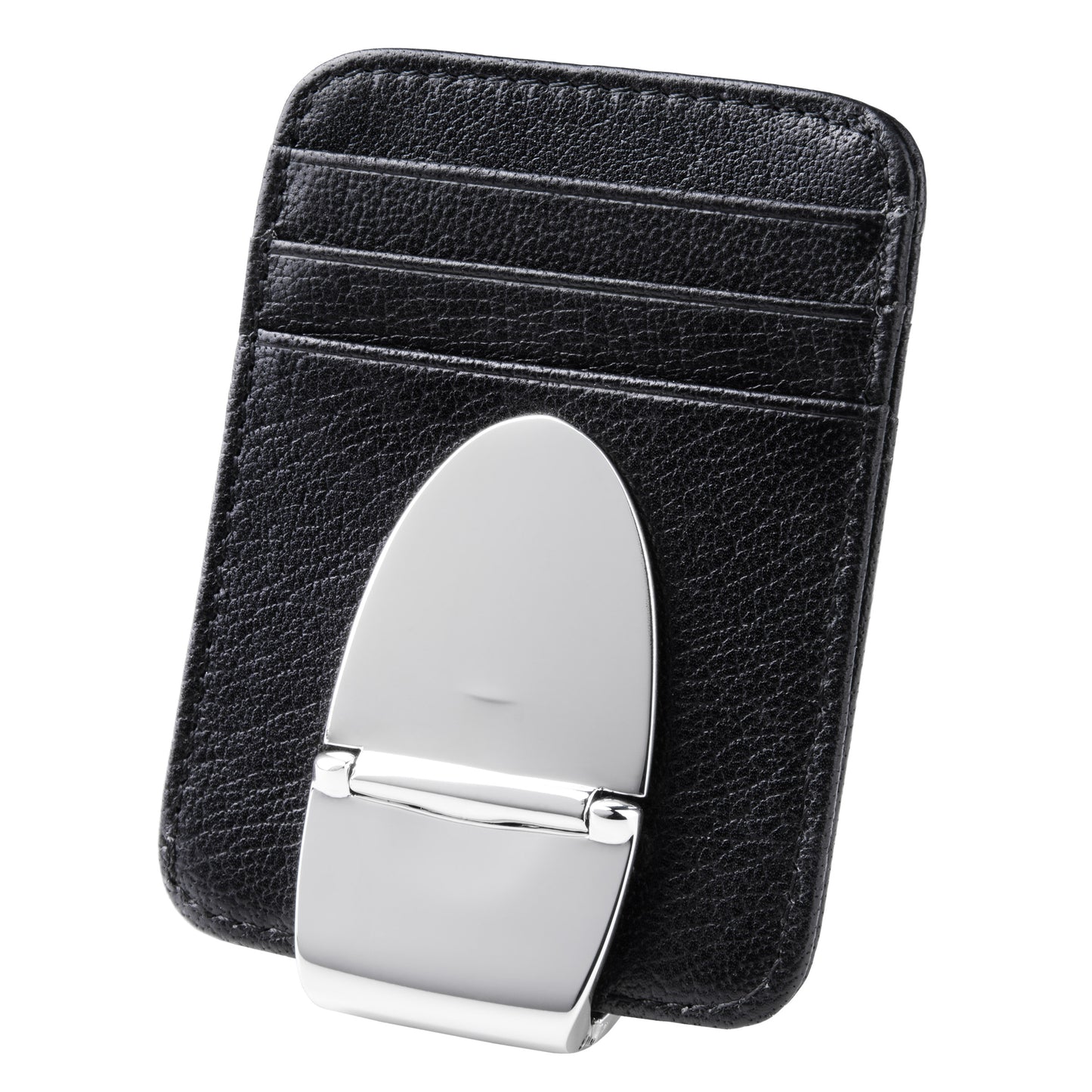 The Milan Silver MoneyClamp® with Black Leather Wallet is an innovative and stylish solution to keeping your valuables safe and organized. Its unique design features the patented MoneyClamp®, crafted from MemoryFlex Steel, a revolutionary alloy that is ten times more pliant than traditional steel. This exceptional flexibility allows the MoneyClamp® to securely hold any number of bills and cards without ever losing its grip. The silver plating not only adds a touch of elegance but also provides superior resistance to corrosion, oxidation, and high temperatures, ensuring the MoneyClamp®'s longevity and pristine appearance.