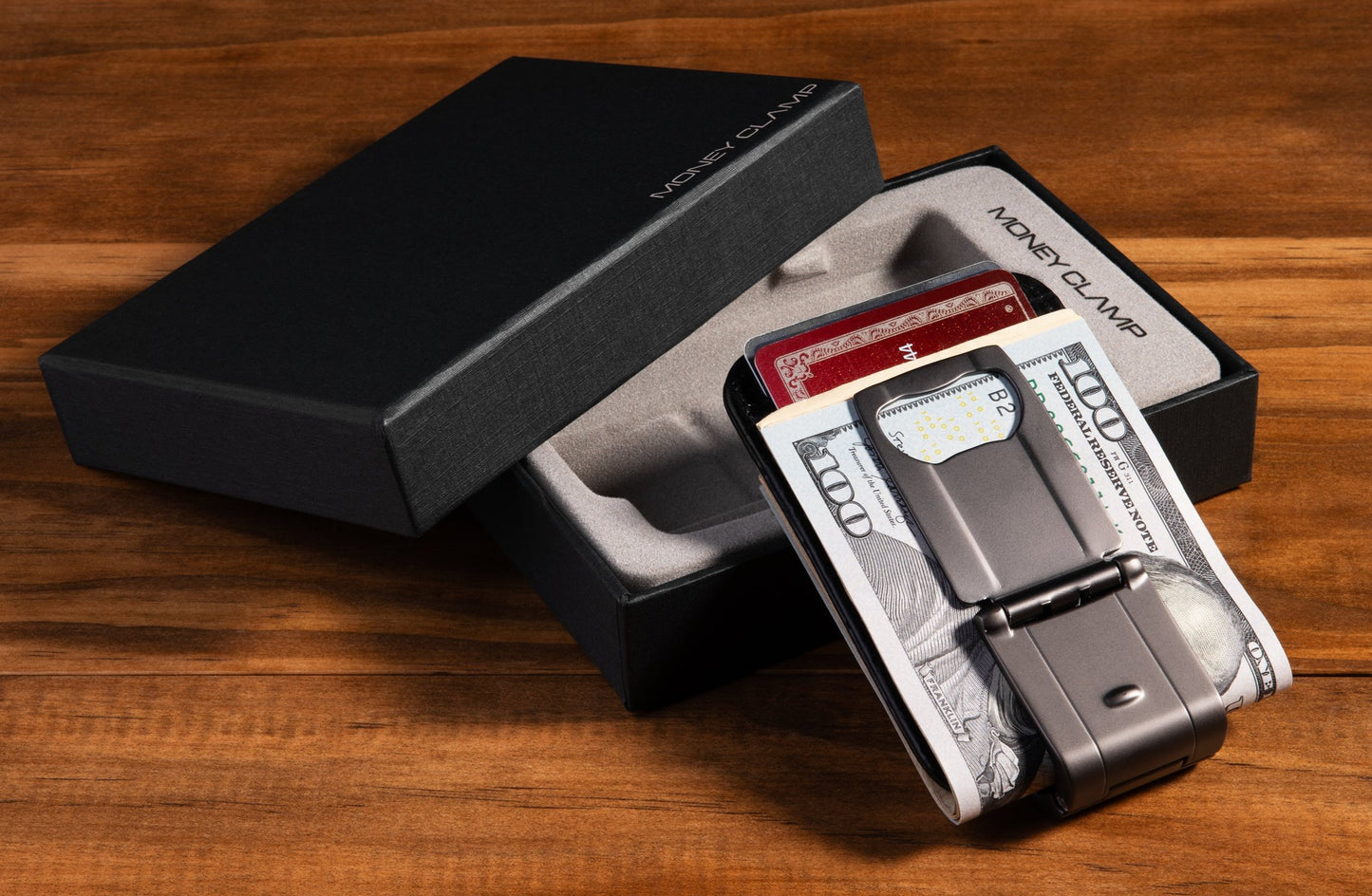 The accompanying black leather wallet complements the MoneyClamp®'s sleek design and offers a sophisticated way to carry your essentials. Its ultra-slim profile ensures it won't add unnecessary bulk to your pocket or bag, while the integrated RFID blocking technology safeguards your sensitive card information from electronic theft.