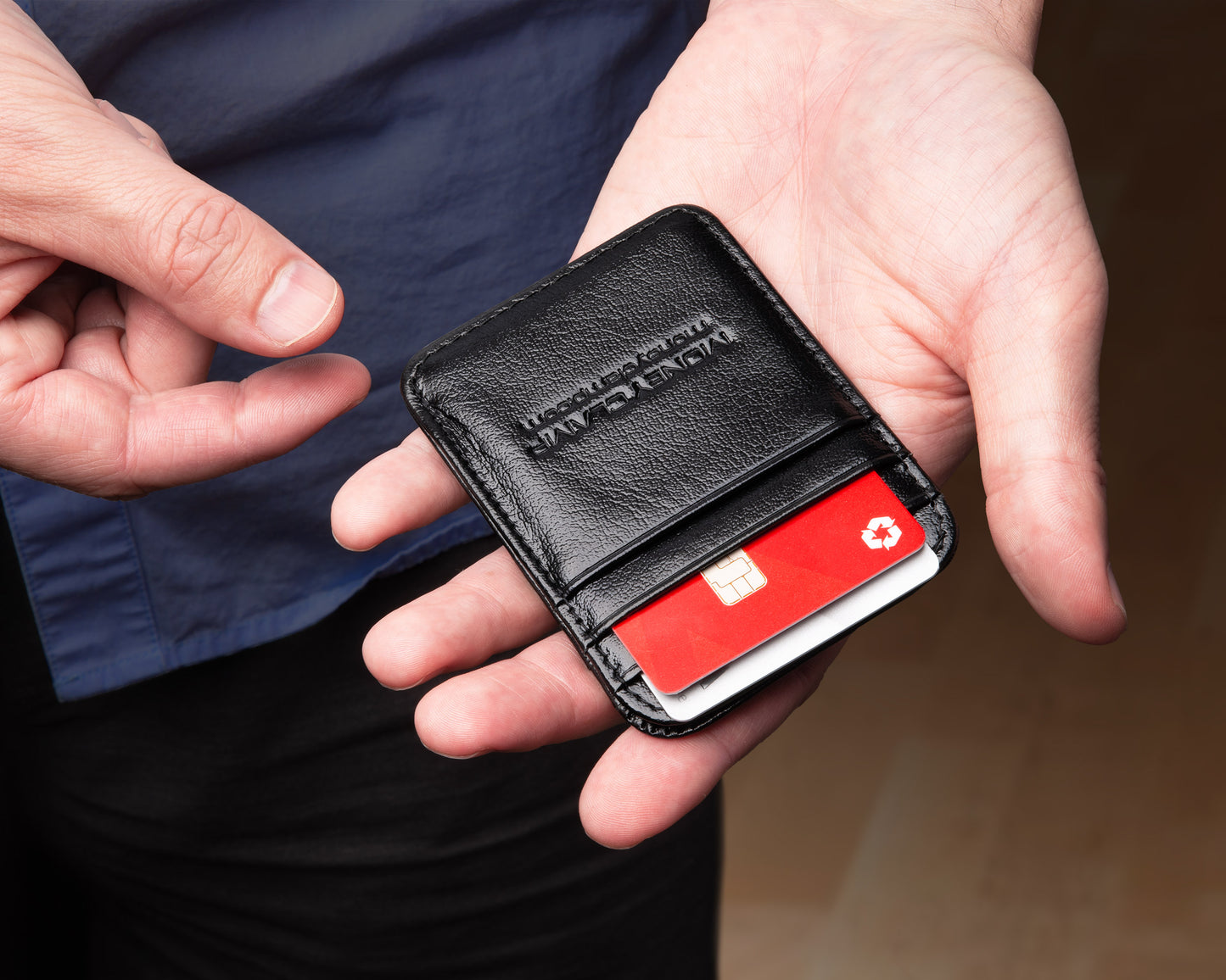 Classic, simple, stylish. Our minimalist, ultra-slim, black leather wallet is a perfect fit for your front or back pocket, and keeps your credit card data safe with RFID blocking technology.