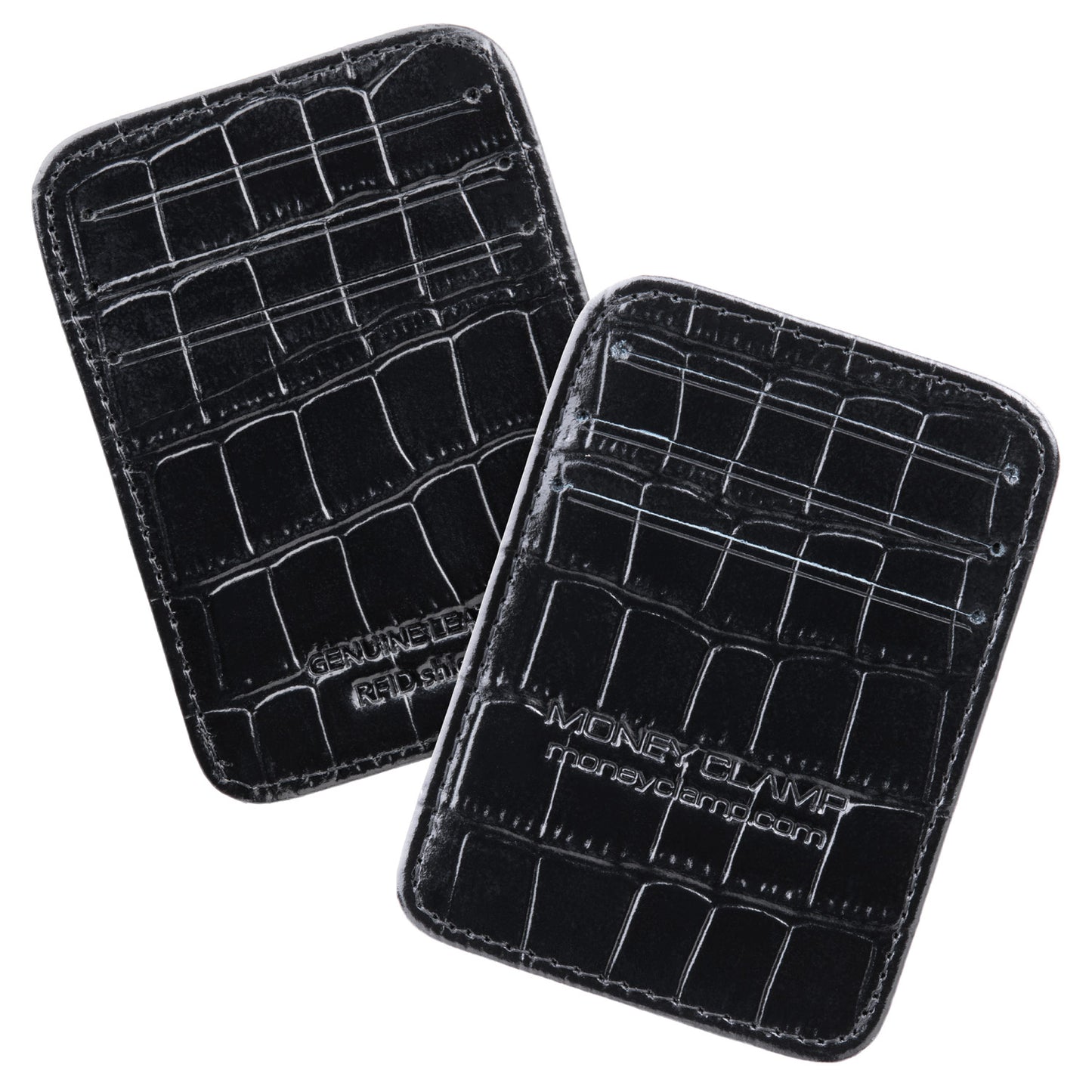 An optimal balance of storage and space-saving efficiency, this wallet combines a slim silhouette with an embossed crocodile scale patterned black leather.